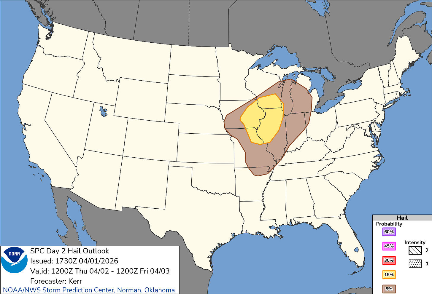 Finally, we have a 15% (not hatched) risk of hail, mainly under two inches in diameter, so not a huge concern. This will most likely be attached to any tornadoes that do spin up or in very isolated storm cells, and hail impacts won’t be widespread.