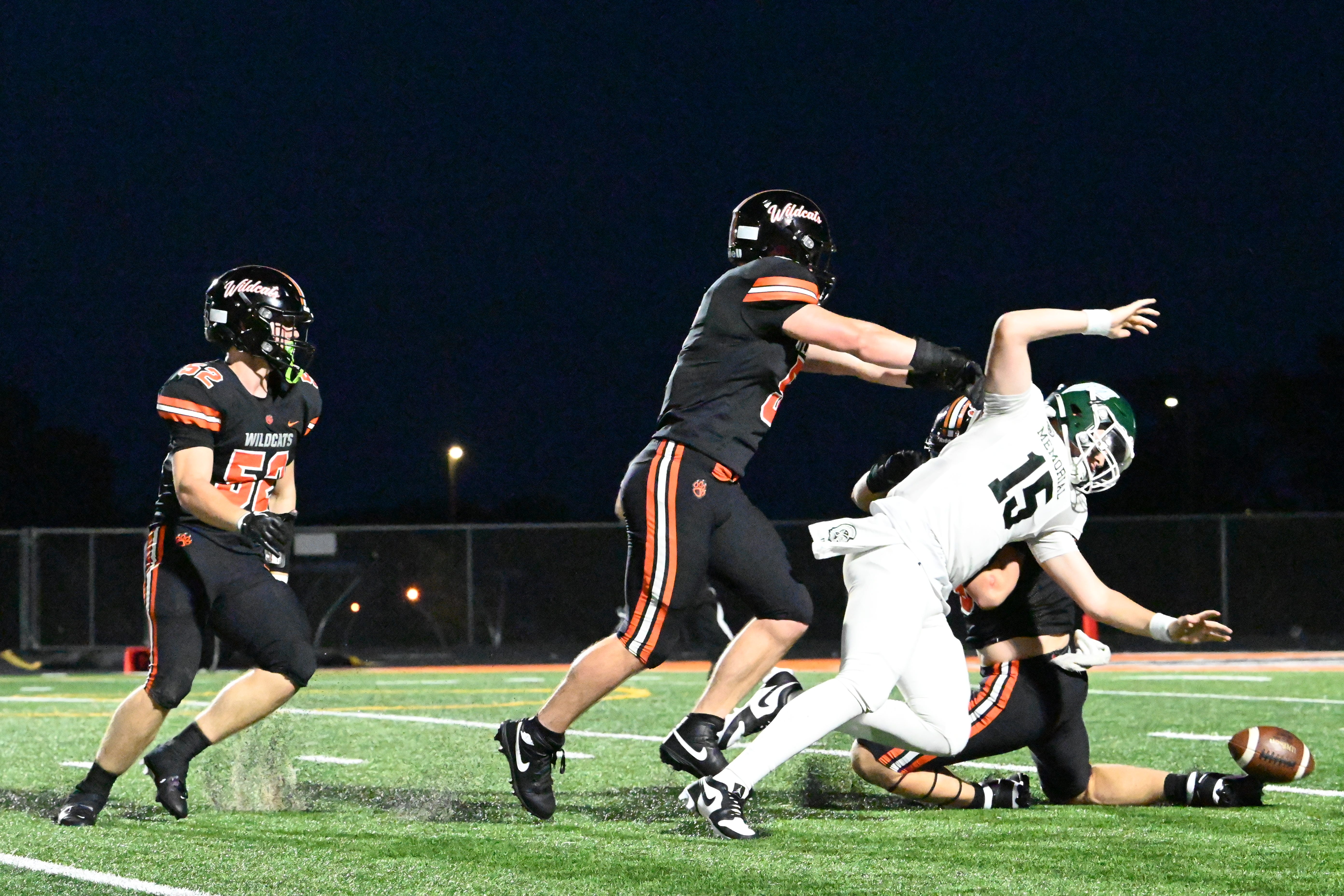 The Wildcats force a fumble from Memorial QB Owen Fiedler, leading to a scoop-and-score, the only touchdown in the game. Photo by Jennifer Bonifas.