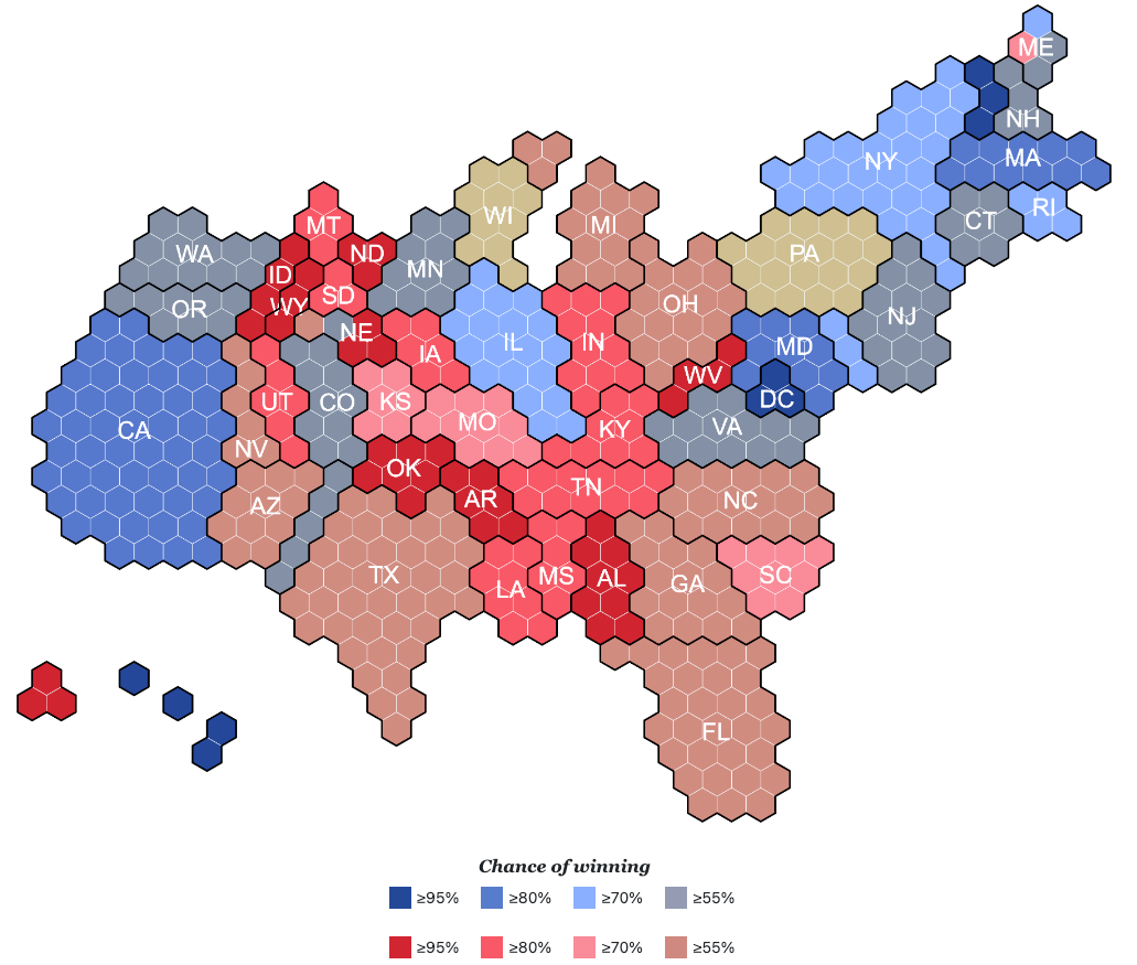 Current state/electoral college forecasts. Each hexagon is one electoral vote.